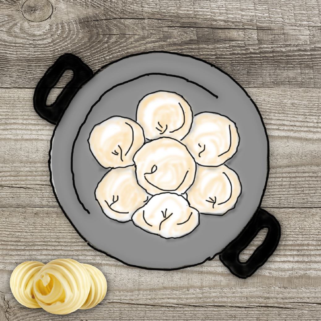 Pelmeni anzubraten erfordert ein bisschen Fingerspitzengefühl und am besten eine gut beschichtete Teflonpfanne. Auf jeden Fall benötigt man recht viel Butter (oder anderes Bratfett). Wer lieber Fett spart, der darf die Pelmeni eben nicht anbraten.