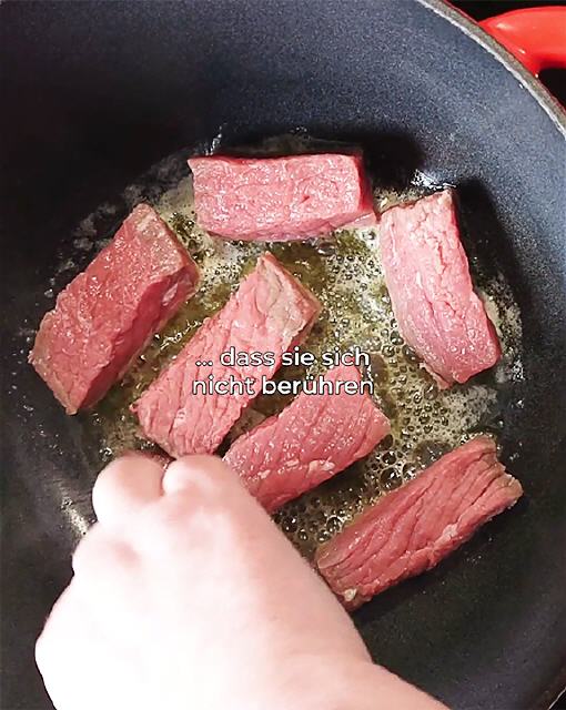 Wir beginnen mit der Zubereitung unseres Boeuf Bourguignons in der Regel am Freitagnachmittag. Ich schneide die Schalotten und das Charolais Rind und brate beides in unserer Cocotte an. Bei unserem Fleischer gibt es das Fleisch dieser Rinderrasse als Standard. Wir haben also Glück und müssen es nicht vorbestellen. Sicher schmeckt das Boeuf aber auch mit dem Fleisch anderer Rinder.