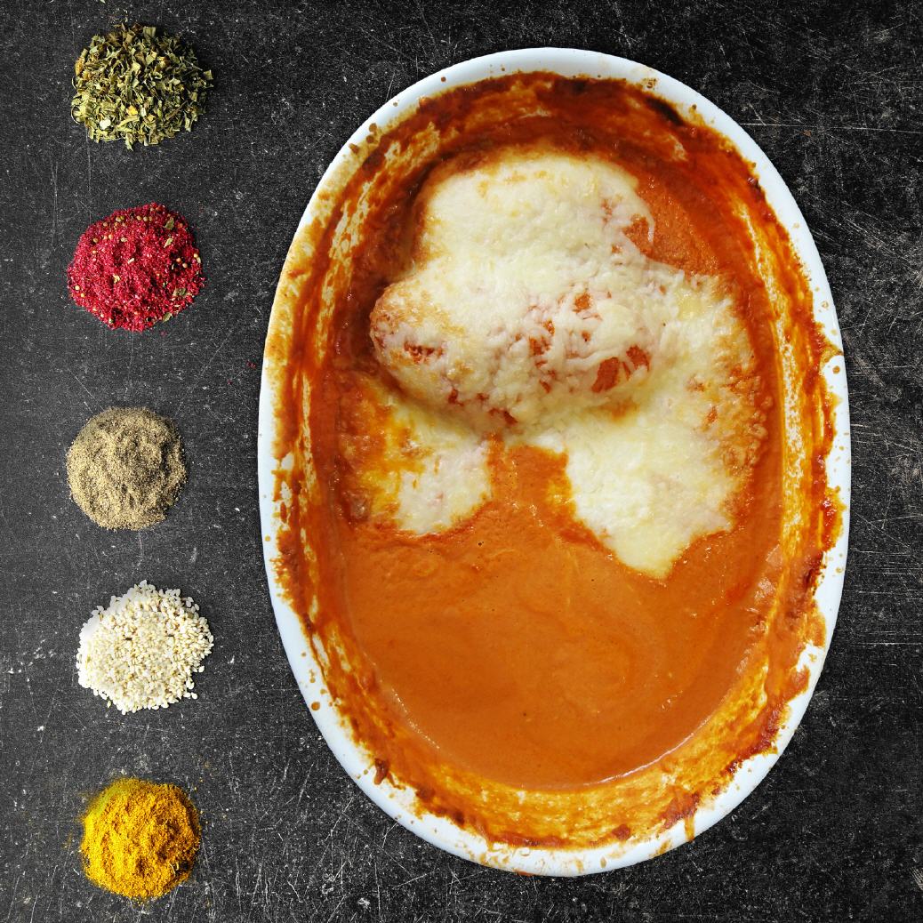 Temperatur auf 180 Grad Umluft und los geht es. Den Garzeitpunkt zu finden, ist immer ein bisschen kniffelig und für mich das Komplizierteste am ganzen Rezept. Ich warte, bis die Soße anfängt zu blubbern. Danach noch so ungefähr 20 Minuten backen (wenn die Hähnchenbrüste noch halb gefroren sind oder ziemlich dick, noch 10 Minuten dazu geben). Kurz vor Ende den Mozarella über das Backgut streuen und schmelzen lassen.