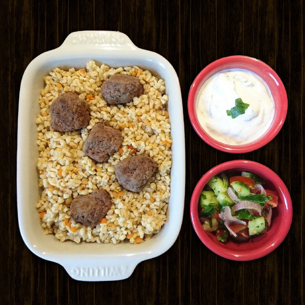Köfte mit Bulgur, roten Linsen und Shirazi-Salat