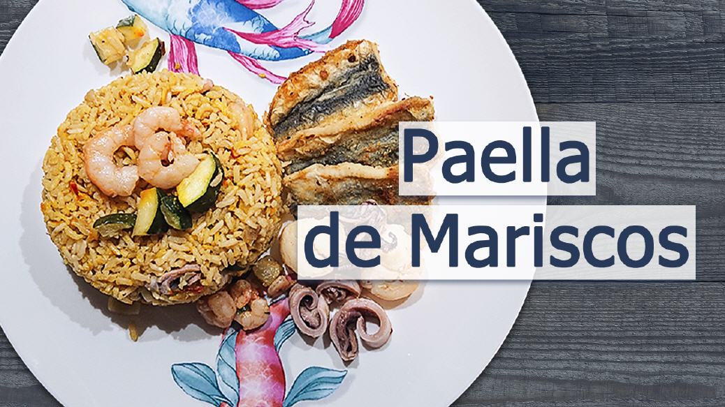 Spanisch kochen: PAELLA DE MARISCOS mit Jakobsmuscheln, Tintenfischlis, Scampis und Sardinenfilets