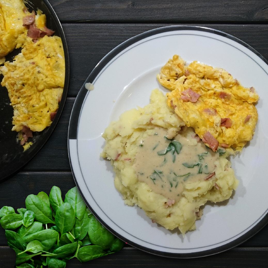Leckeres kann so einfach sein. Unter das Rührei haben wir etwas angeschwitzten Katenschinken gehoben und der Schinken mundete auch im Kartoffelpüree ausgezeichnet. Die Béchamel ist selbst gemacht und mit Gorgonzola abgeschmeckt. Außerdem gaben wir noch etwas Babyspinat hinzu.